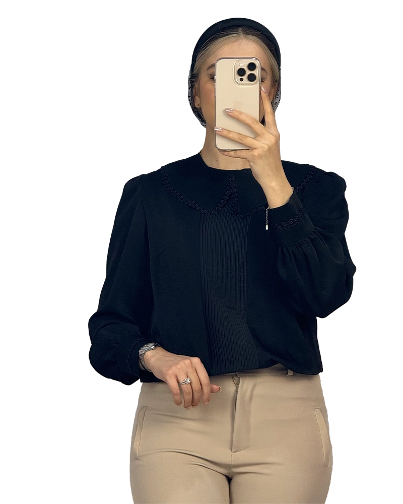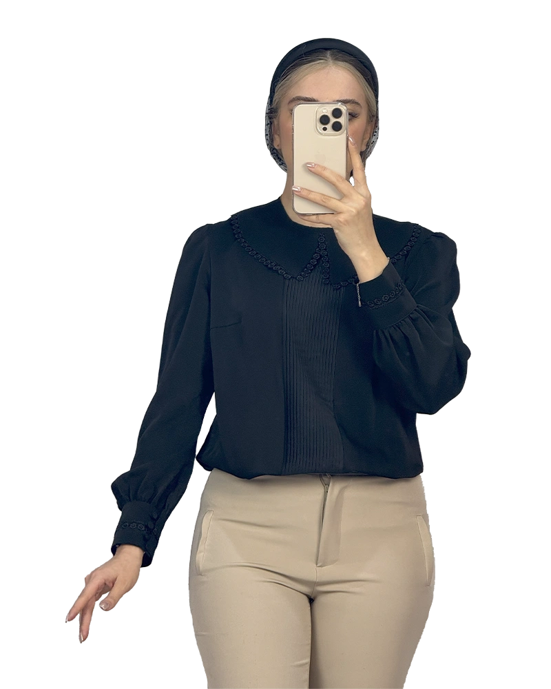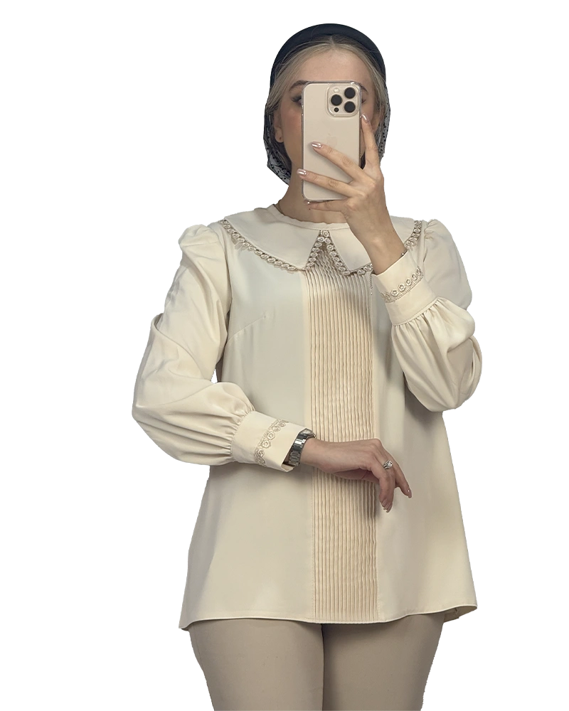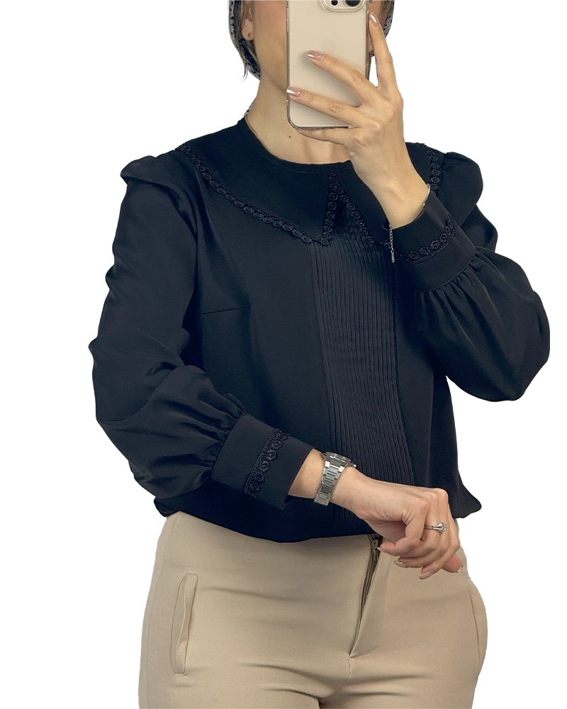 طراحی یقهی شومیز ژاکلین، کاردار و پهن است که با نوار گیپوری تزیین شده. این جزئیات ظریف، استایل شومیز را از یک طراحی ساده به مدلی خاص و شیک تبدیل کرده و جلوهای کلاسیک به آن بخشیده است.