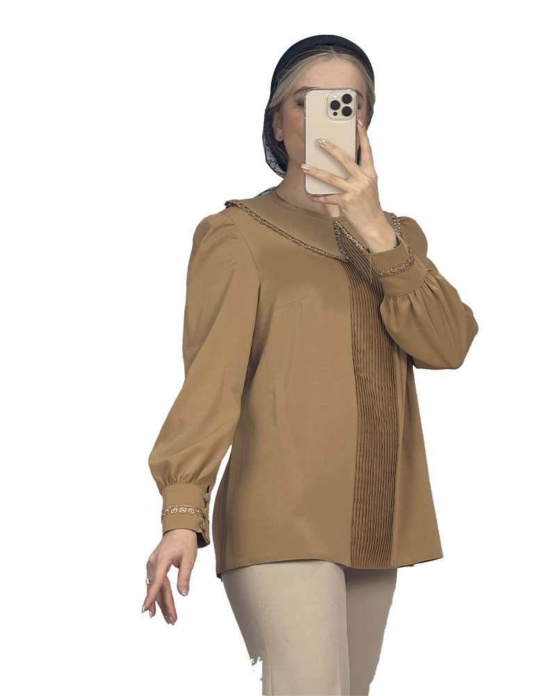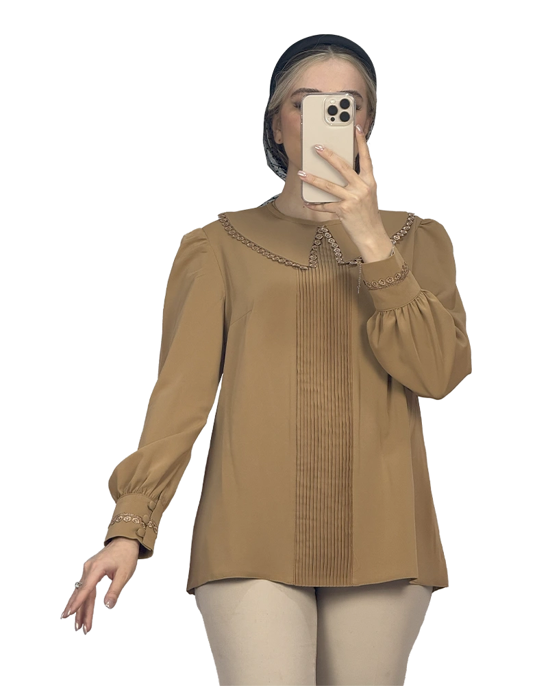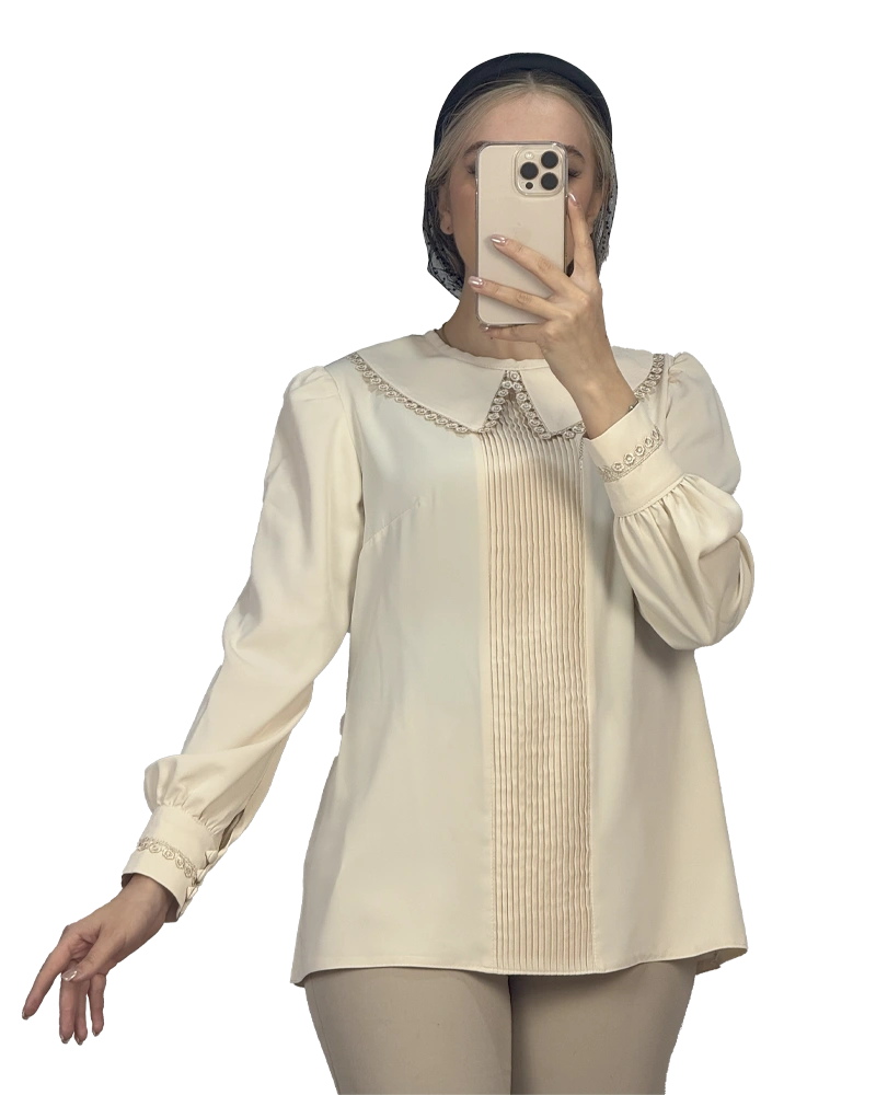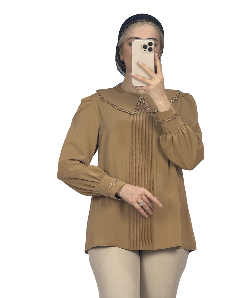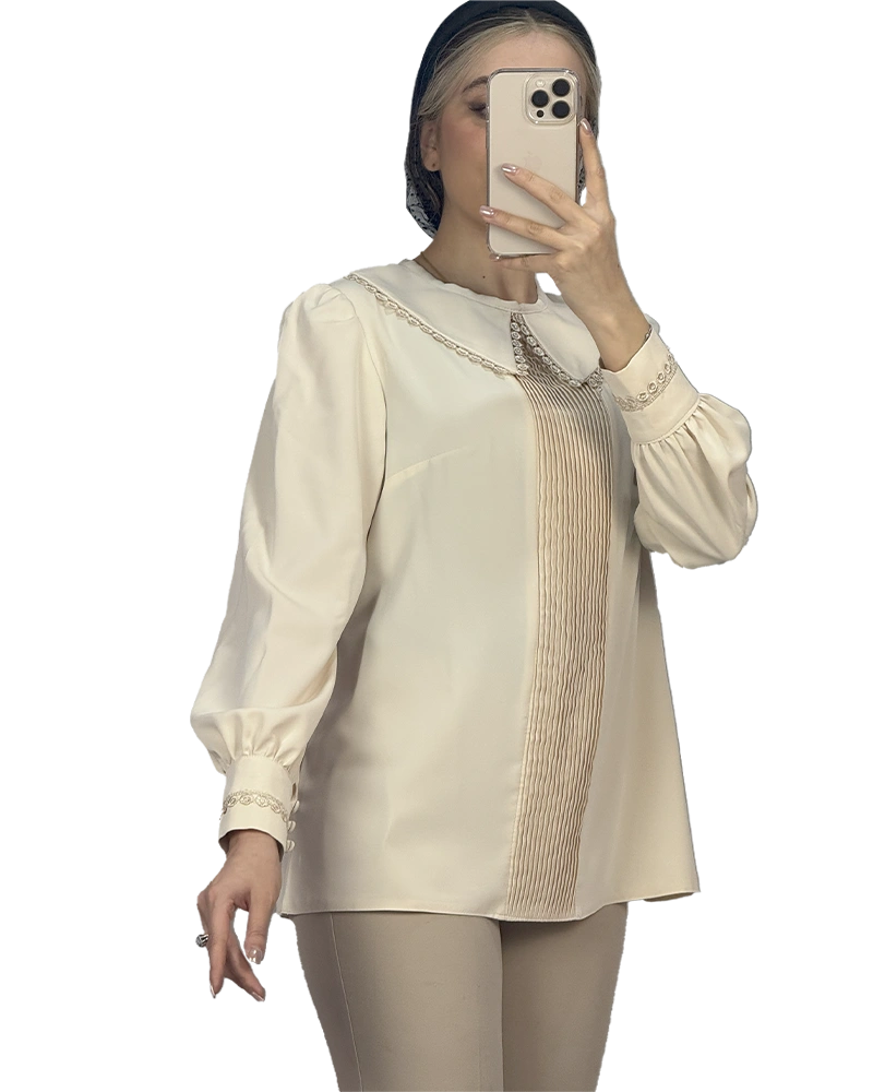 طراحی یقهی شومیز ژاکلین، کاردار و پهن است که با نوار گیپوری تزیین شده. این جزئیات ظریف، استایل شومیز را از یک طراحی ساده به مدلی خاص و شیک تبدیل کرده و جلوهای کلاسیک به آن بخشیده است.