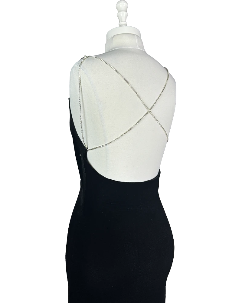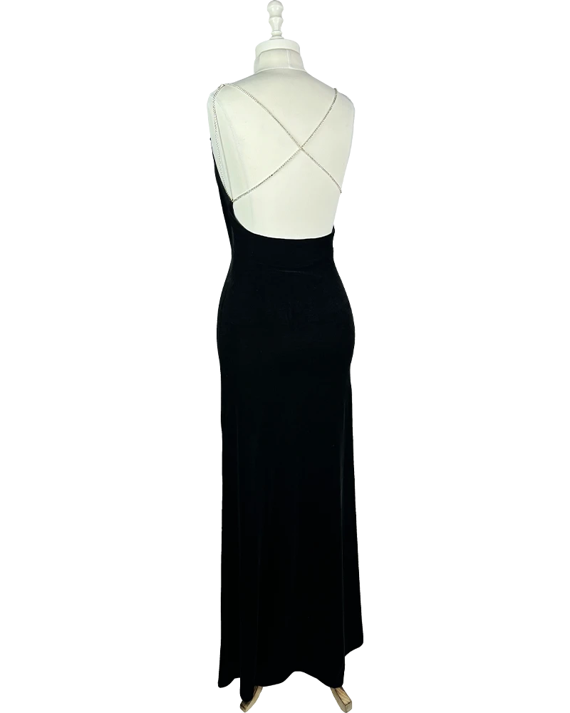 یه پیراهن ماکسی مشکی با بندهای زنجیری نقرهای، یقه دراپهی نرم و پشت باز ترکیبی از ظرافت، جسارت و زرقوبرق کنترلشده.